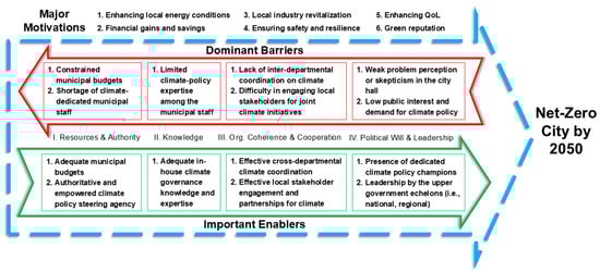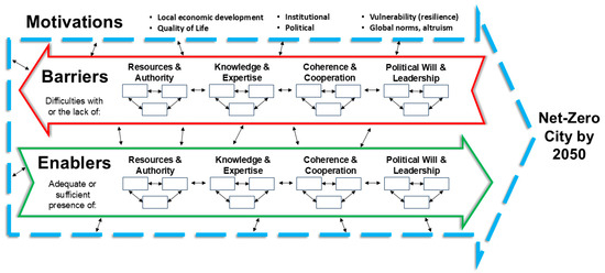 Yet, given the magnitude of the challenge of closing the global emissions gap [16], the uptake of local net-zero commitments remains insufficient and uneven, while local action often lacks the necessary follow-through [11,17] and may be vulnerable to backsliding amid major crises and political shifts [18,19]. These concerns underscore the importance of clarifying and reinforcing compelling motivations—strong enough to inspire and drive local actors forward—while simultaneously fostering a conducive environment for progress by strengthening key enablers and addressing critical barriers. All these elements are necessary to ensure stronger and more consistent progress.