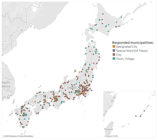 Survey sample of 489 Zero-Carbon Cities—Japanese municipalities committed to net-zero emissions (as of January 2022). Colored dots indicate the 309 responding municipalities (differentiated by administrative status); white dots represent non-respondents. Source: Authors; visualization created using Tableau Desktop (version 2025.1.2).
