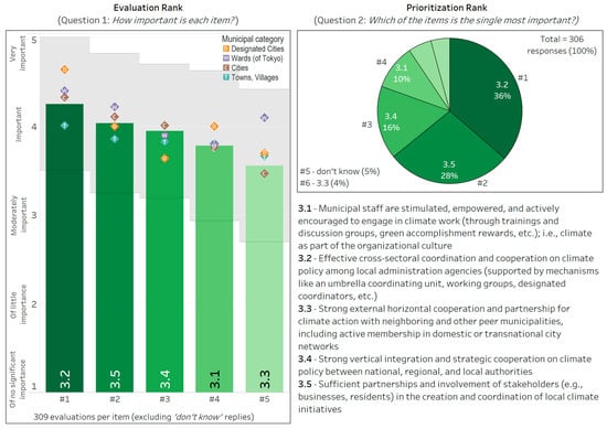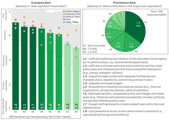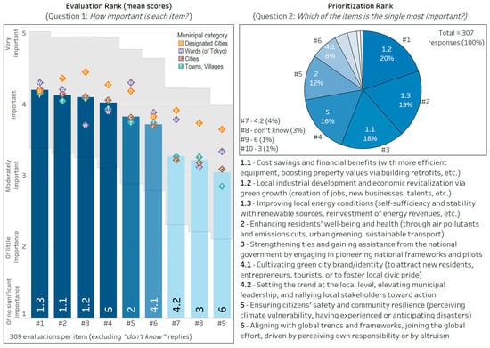 Motivations toward achieving net-zero emissions by municipalities. Bars represent the mean evaluation scores of each item across all municipalities (±1 standard deviation shown in gray). Colored diamond markers show mean scores by municipal type. The pie chart displays the proportion of municipalities selecting a specific item as “the single most important” motivation (percentages may not total 100% due to rounding). Numbers following the # symbol indicate the items’ resulting ranks. Source: Created by the authors based on survey response data (software: Tableau Desktop ver. 2025.1.2).