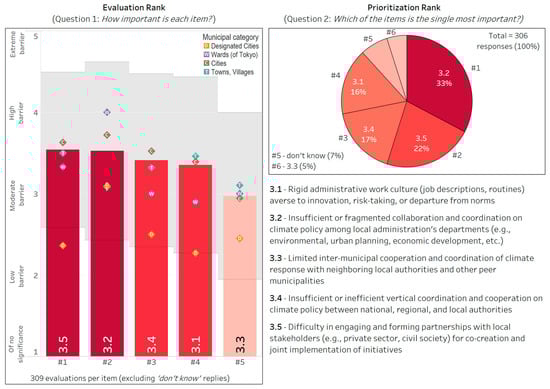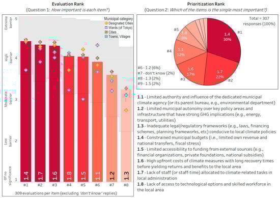 The lack of climate-dedicated staff (B1.7) is another prominent barrier, rated highly on average and prioritized by every fifth respondent. Although closely related to budget constraints, staffing presents a separate issue, representing another severe barrier to municipalities’ climate actions. This barrier is consistently significant across all municipalities, albeit somewhat less acute in Tokyo wards.