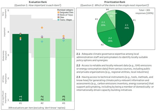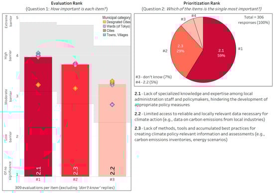 Barriers to achieving net-zero emissions by municipalities (Category II: Municipal capacity constraints—knowledge and expertise). Bars represent the mean evaluation scores of each item across all municipalities (±1 standard deviation shown in gray). Colored diamond markers show mean scores by municipal type. The pie chart displays the proportion of municipalities selecting a specific item as “the single most important” within its category (percentages may not total 100% due to rounding). Numbers following the # symbol indicate the items’ resulting ranks. Source: Created by the authors based on survey response data (software: Tableau Desktop ver. 2025.1.2).
