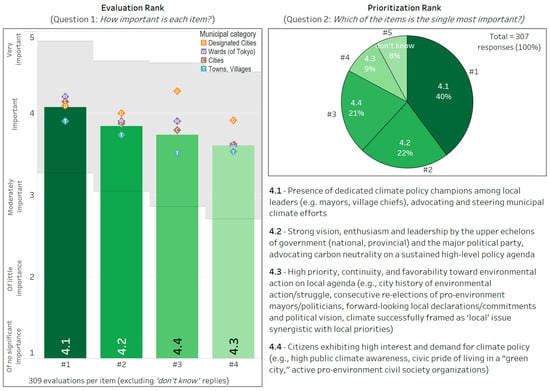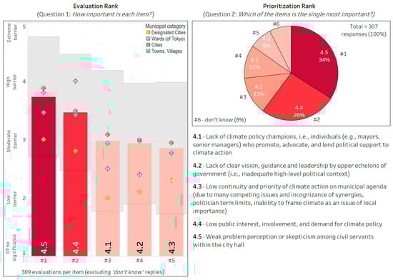 Barriers to achieving net-zero emissions by municipalities (Category IV: Insufficient leadership and political will). Bars represent the mean evaluation scores of each item across all municipalities (±1 standard deviation shown in gray). Colored diamond markers show mean scores by municipal type. The pie chart displays the proportion of municipalities selecting a specific item as “the single most important” within its category (percentages may not total 100% due to rounding). Numbers following the # symbol indicate the items’ resulting ranks. Source: Created by the authors based on survey response data (software: Tableau Desktop ver. 2025.1.2).
