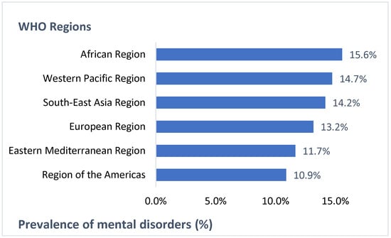 Overview of the prevalence of mental health disorders by WHO regions (2019) [5]: source, drawn by authors based on the data from IHME [10].