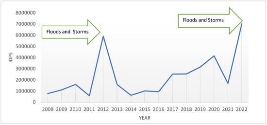 Overview of disaster-related internally displaced persons (IDPs) in Africa from 2008–2022; source: the Internal Displacement Monitoring Centre (IDMC) database, which monitors and reports on situations where people are forced to flee their homes but remain within their own country due to conflict, violence, disasters, or human rights violations.