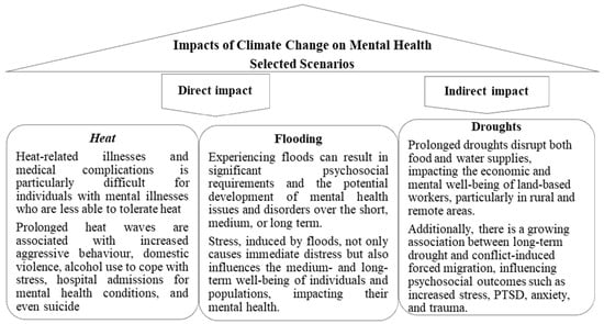 Also, drought scenarios present various challenges, including food and water scarcity, compromised water quality, conflicts with wildlife, and population migration, all of which can contribute to adverse mental health outcomes. Moreover, communities grappling with inadequate access to essential social and health services, especially in maternal and childcare, face additional stressors that can exacerbate mental health issues. This, in turn, often leads to an uptick in alcohol and substance abuse, as noted by [22]. Experiencing floods and the sudden loss of shelter, coupled with struggles to meet basic needs, can significantly impact mental health. Despite the prevalence of stress disorders and depression in such situations, these mental health issues often remain undiagnosed and untreated. Climate change-induced migration further compounds these challenges, particularly affecting women and girls, leading to notable deterioration in their mental, sexual, and reproductive health in insecure environments [23]. Flooding exacerbates or triggers severe psychosocial distress due to significant socio-economic losses, leading to a spectrum of mental health disorders, such as PTSD, depression, and anxiety, with some even contemplating suicide. Emotional responses often center around profound feelings of grief and loss, contributing to increased substance abuse and a reliance on psychotropic medications in affected populations [24].