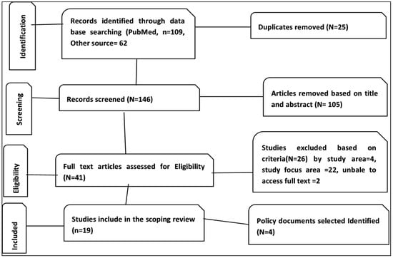 The data search and rapid assessment yielded 170 articles, of which 109 were sourced from the PubMed database and 62 from other search sources, such as Google Scholar, Google, and Reference List. During the initial phase, 105 articles were excluded based on titles and abstracts, and additionally, 25 articles were removed due to duplication. In the screening process, an additional 25 articles were excluded due to non-alignment with the desired eligibility criteria, such as variations in the study settings and differences in the focus of this study. Subsequently, the full text of the remaining 19 articles, including policy documents, was accessed to determine eligibility and included in the analysis (Figure 3).
