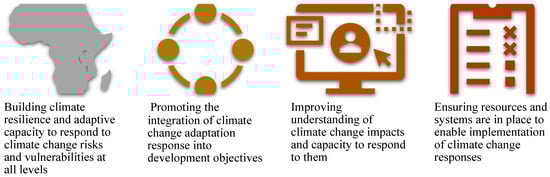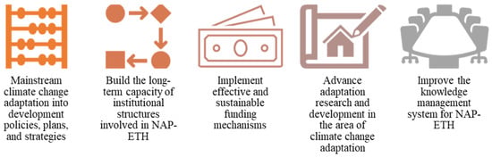 Ethiopia, located in East Africa, is one of the countries that is highly vulnerable to the impacts of climate change and variability. The country’s limited livelihood options for much of the population, inadequate disaster resilience, and exposure to biophysical shocks further exacerbate its vulnerability. To address these issues, Ethiopia has developed a comprehensive and up-to-date strategy called Ethiopia’s Climate Resilient Green Economy—National Adaptation Plan (NAPETH) 2019 [67]. The strategy reflects on integrating climate change adaptation into national, regional, and local policies toward a long-term timeframe, combining adaptation and development action. It identified five strategic priorities to achieve its objectives, as noted in Figure 5.