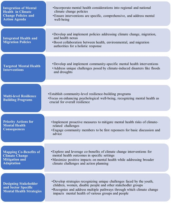Integrated approaches are crucial to strengthening coping mechanisms, offering comprehensive protection against the diverse impacts of climate-related vulnerabilities. Stakeholders aiming to assess climate change impacts on mental health should comprehensively explore various pathways and conduct inclusive research that incorporates perspectives from vulnerable populations [55]. To this need, we identified three key points after assessing the region’s existing adaptation, preparedness, and response plans.