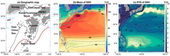 The Kuroshio, a western boundary current in the North Pacific, flows northward after bifurcating from the North Equatorial Current (NEC), passes to the east of the Luzon Strait and Taiwan, and enters the East China Sea (ECS). The main path of the Kuroshio branches to the southwest of Kyushu (Figure 1a), with approximately 11% intruding into the shelf region of the ECS and flowing into the East/Japan Sea (EJS) through the Korea/Tsushima Strait (KTS) [1,2,3,4]. The inflow through the KTS transports subtropical buoyant water from the western North Pacific to the EJS, governing upper-ocean circulation and climate variability in the EJS [4,5,6,7]. It is important to investigate how the inflow through the KTS varies and what regulates this variability in order to understand ocean environmental variability in the EJS [8,9,10].