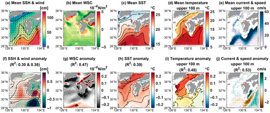 (Top) The mean environmental variables in the western North Pacific for 1985–2017: (a) sea surface height (SSH) and the wind (vector); (b) wind-stress curl (WSC; color shading interval: 0.5 10−8 N/m2); (c) sea surface temperature (SST); (d) the upper 300 m depth-averaged temperature; and (e) the upper 300 m depth-averaged currents (vector) and speed. (Bottom) Regression anomalies onto the second mode of the barotropic SLD across the Korea/Tsushima Strait: (f) SSH (contour) and wind (vector); (g) WSC; (h) SST; (i) upper 300 m depth-averaged temperature; and (j) upper 300 m depth-averaged currents (vector) and speed. The R-squared values of each regression are presented in parentheses with statistical significance at the p < 0.05 level. The blue square and red dot denote the location of Busan (the Republic of Korea) and Hakata (Japan), respectively.