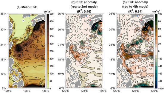 The ENSO-related and ENSO-irrelevant modes of current variability depicted in Figure 5 could be related to changes in the inflow through the KTS via different processes of ocean environmental variability. Figure 6 depicts the mean EKE and regressed EKE anomalies for the second and fourth modes of current variability at 99 m from 1993 to 2017, as displayed in Figure 5. Both of the regressed anomalies exhibit an increase in the EKE to the east and southeast of Taiwan; however, the amplitude is greater for the regression targeting the fourth mode (ENSO-irrelevant mode). Specifically, the EKE anomaly that regressed onto the ENSO-irrelevant mode (Figure 6c) showed notable peaks along 21° N, whereas the anomaly that regressed onto the ENSO-related mode (Figure 6b) was weaker in this region. The higher R-squared value of the regression also suggests that the ENSO-irrelevant mode of current variability is strongly associated with the EKE variability. The EKE anomaly, when regressed onto the ENSO-irrelevant mode, exhibits strong positive anomalies, particularly along 21° N, possibly due to an enhancement in baroclinic instability between the NEC and the STCC (see Figure 5c and the third column in Figure 6) [22,52]. In addition, strong positive anomalies of EKE are observed to the east of the Tokara Strait. Understanding how these anomalies influence the interannual variability of the inflow throughout the KTS requires more in-depth analysis, which is beyond the scope of this study.