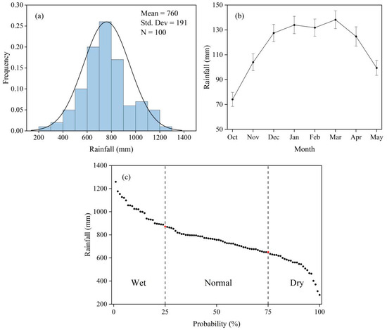According to the probability of fallow-season rainfall (Figure 2c), these 100 years were categorized into three categories: 25 wet years (876–1264 mm, mean = 1010 mm), 50 normal years (636–872 mm, mean = 751 mm), and 25 dry years (286–631 mm, mean = 528 mm).
