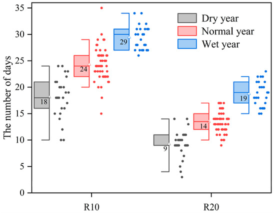 The number of days when rainfall was ≥ 10 mm/d (R10) and rainfall was ≥ 20 mm/d (R20), sorted by fallow-season rainfall amount from 1924 to 2023 in Noxubee County, Mississippi. Box plots show the 25th, 50th, and 75th percentiles (box lines), with brackets indicating the 5th and 95th percentiles. Triangle symbols and numbers inside the boxes represent mean values.