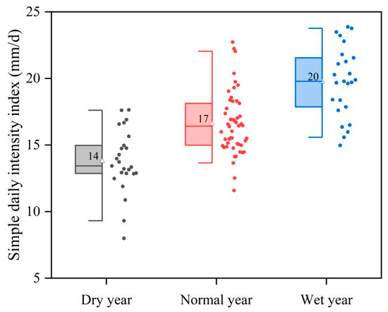 However, extreme rainfall characteristics varied across different rainfall years. Dry years experienced fewer extreme rainfall (0–4 events, 6 years without extreme rainfall) and lower R95p (mean = 72 mm), leading to the lowest R95pTOT at 13%. In normal years, the frequency of extreme rainfall ranged from 1 to 5 events (only 4 years without extreme rainfall), and the mean R95p was 152 mm, accounting for 20% of the fallow-season rainfall. In contrast, wet years experienced both higher frequency (2–7 events) and intensity (mean R95p = 284 mm), with extreme rainfall contributing 28% of total rainfall. Similarly, the simple daily rainfall intensity followed this trend, increasing from 14 mm/day in dry years to 20 mm/day in wet years (Figure 5).
