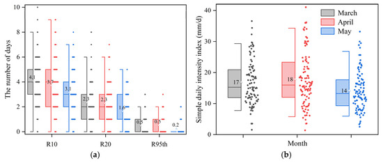 Very heavy rainfall and extreme rainfall events contributed more than 43% and 17% of the total rainfall, respectively. April exhibited pronounced extreme rainfall characteristics, demonstrated by a higher mean SDII value of 18 mm/day and extreme rainfall contributing up to 29% of the total rainfall (Figure 6b). In contrast, extreme rainfall events occurred less frequently and exhibited lower intensity in May: the median values of R10 and R20 were 3 and 1 days, respectively, one day fewer than those recorded in March and April (Figure 6a). Additionally, the 100-year record also showed a clear difference in extreme rainfall frequency: extreme events occurred in 37 of these years during March and April, but only in 19 years in May.
