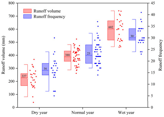 Due to variations in rainfall, the mean runoff increased from 227 mm in dry years to 388 mm in normal years and reached 602 mm in wet years, with 80% of years exhibiting runoff of between 210 and 608 mm. Similarly, the mean runoff frequency showed a consistent rise, climbing from 16 events in dry years to 23 in normal years and peaking at 30 in wet years, with 80% of the observed years falling between 15 and 30 (Figure 7). Furthermore, the mean runoff-to-rainfall ratio increased from 42% in dry years to 52% in normal years and reached 62% in wet years.
