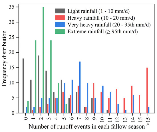 Light rainfall led to fewer than eight runoff events in 92% of fallow seasons, whereas heavy rainfall triggered over five runoff events in 82% of years (Figure 8). Very heavy rainfall was the dominant driver of runoff events (mean frequency = 11), with more than 65% of years recording 7–13 events. Extreme rainfall, however, typically resulted in fewer than 5 events.