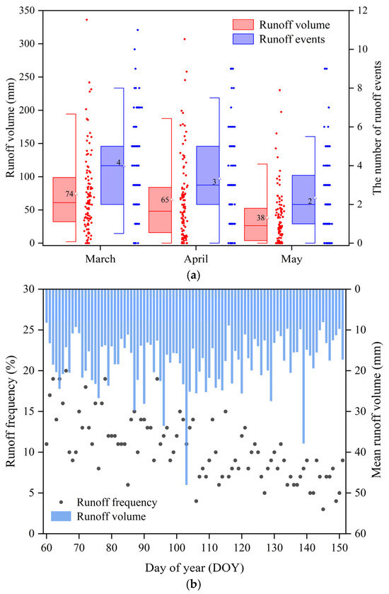(a) The monthly frequency and volume of runoff in spring. (b) The frequency of runoff events and mean runoff volume on each day (DOY 60-151). Box plots show the 25th, 50th, and 75th percentiles (box lines), with brackets indicating the 5th and 95th percentiles. The triangle symbols and numbers inside the boxes represent mean values.