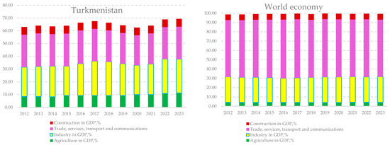 In contrast to Kazakhstan, an analysis of the GDP structure of Kyrgyzstan, Tajikistan and Uzbekistan reveals that their economies are characteristic of lower-middle-income countries, where agriculture plays a more significant role (15.3–26.1%). In Turkmenistan, industry dominates (49.5%), primarily due to the country’s specialization in mineral extraction (Figure 2). By comparison, in global production, the services and trade sector hold a stable leading position, accounting for approximately 64%, while agriculture contributes only 4.27%. This disparity suggests that much of the value created by humanity is driven by the pursuit of marginal income rather than the generation of real added value. Such trends are reshaping societal awareness of the need for environmental protection.