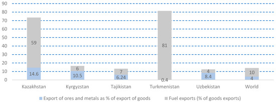 Export of raw materials in total export volume by CACs and the world, %. Source: compiled based on https://data.worldbank.org/assets/images/placeholder.png (accessed on 12 October 2024).