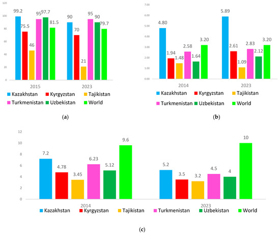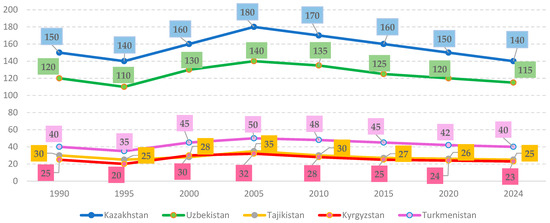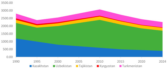 Currently, Kazakhstan, Turkmenistan and Uzbekistan have defined national targets as part of their green economy strategies, while Kyrgyzstan and Tajikistan have chosen to concentrate on programs for climate change mitigation and adaptation, likely because of the significant contribution of hydropower in the country’s energy balance. CACs are gradually including in their national programs and policies the development of renewable energy sources (RES), stimulation of sustainable agricultural development and implementation of a circular approach to the use of natural resources [25]. The World Bank projects that global growth will increase to an average of 2.7% in 2025–2026 (https://www.imf.org/en/Publications/WEO/Issues/2024/10/22/world-economic-outlook-october-2024, accessed 2 November 2024). Based on the World Economic Outlook report from the International Monetary Fund (IMF), among the CACs, Uzbekistan has the highest projected real GDP growth for 2026 (5.5%), followed by Kazakhstan (4.4%), Kyrgyzstan, Tajikistan (4% each) and Turkmenistan (3.7%) (https://www.imf.org/en/Publications/WEO/Issues/2024/10/22/world-economic-outlook-october-2024, accessed 2 November 2024).