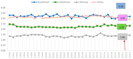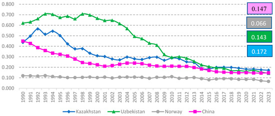 The link between economic structure and emissions levels is confirmed by econometric indicators: the carbon intensity of GDP in countries dependent on hydrocarbon exports (Kazakhstan, Turkmenistan), is 0.5–0.6 kg CO2/$1 GDP, while in Kyrgyzstan and Tajikistan this figure is lower (0.2–0.3 kg CO2/$1 GDP). Evidence of excessive energy consumption in CACs, particularly in Uzbekistan and Kazakhstan, is demonstrated by the energy intensity indicator, measured as energy use per $1000 of GDP for the period 1990–2023 (Figure 5). This indicator is significantly higher than that of developed countries, such as Norway (2–4 times higher) and China (1.5–2 times higher), which were selected for comparison [32]. High energy intensity is often associated with the predominant use of fossil fuels for energy generation, leading to elevated GHG emissions. The data presented herein suggest that Kazakhstan and Uzbekistan exhibit the highest levels of energy and carbon intensity within the Europe and Central Asia region.