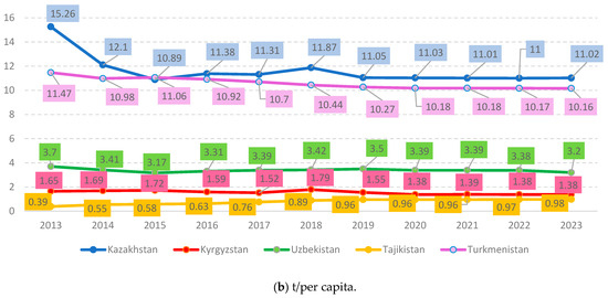 Notably, Kazakhstan exhibits a high level of energy consumption, with per capita energy use reaching 5890 kWh in 2023, significantly higher than the global average of 3200 kWh per capita (Figure 4). Furthermore, Figure 4 reveals that between 2014 and 2023, the CACs experienced a decline of 8–27% in GDP per unit of energy consumed, indicating a decrease in energy efficiency. In contrast, during the same period, global GDP per unit of energy consumed increased by 4%. This decline in energy efficiency in Central Asia is primarily driven by rising energy consumption and the expansion of energy-intensive industries within the regional economies. It is worth noting that the growing construction sector currently accounts for more than a fifth of global emissions in energy demand and emissions. The building sector is seeing a resurgence in expansion, which has a tremendous direct and indirect effect on the environment taken as one of the most waste-producing and waste-producing sectors of the economy [48]. The global construction sector emitted a total of 5.7 billion tons in 2009, accounting for 23% of the total CO2 emissions generated by economic activities worldwide [48,49]. The residential sector is the largest consumer of electricity after the mining and industrial sectors in CACs. About 75% of buildings in the region were built in the 1950s–1990s and do not meet modern energy efficiency standards. For example, energy consumption in the residential sector of Kazakhstan is about 270 kWh/m2, which is 2.7 times higher than in Europe (https://research.nu.edu.kz/en/publications/household-energy-consumption-and-energy-poverty-in-kazakhstan, accessed on 18 August 2025).