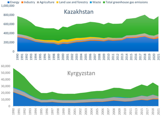 - Assessment of the ecological-climatic changes impact on air quality of the region: It was used the National Communications and the Biennial Reports of the CACs to the UNFCCC [36,37,38,39,40]. The use of GHG inventory data in the analysis of atmospheric emissions in Central Asia is justified, because they are based on international standardized methodologies Intergovernmental Panel on Climate Change (IPCC) Guidelines 2006, mainly Tier 1, (Tier 2 Method: for waste, agriculture sectors), which allows for the comparison of analogous data, the assessment of emissions and their sources [41]. CH4 emissions mainly occur in agricultural production were obtained from GHG inventory data, supplemented by data from the Bureau of National Statistics and TheGlobalEconomy.com [28,35,42]. The lack of data on other pollutants from industry, transport, and energy that are not related to GHGs, such as PM2.5, was filled in from relevant sources [29,30,31,32,33,34].