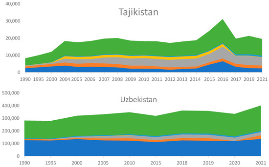 - Identification of the Central Asia economy sectors features was carried out using environmental indicators, economic and energy indicators that make it possible to understand the relationship between economic activity and the level of atmospheric pollution [17,23,28,29,30,31,32,33,34]. Data regarding energy, fuel consumption and air emissions are gathered and systematized by national statistical offices, energy departments and environmental protection agencies. The work used information from the National Statistics Bureau of the CACs; however, it should be noted that they are systematized mainly in Kazakhstan and Kyrgyzstan. Thus, only in Kazakhstan and Kyrgyzstan are the National Ambient Air Quality Standards (NAAQS) enshrined in laws available for review [29,35]. The following are used as key indicators: