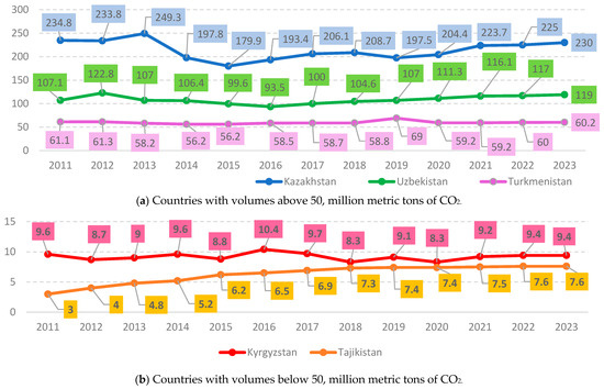 - Dynamics of CO2 emissions by burning fossil fuels of CACs for the period 1990–2022;