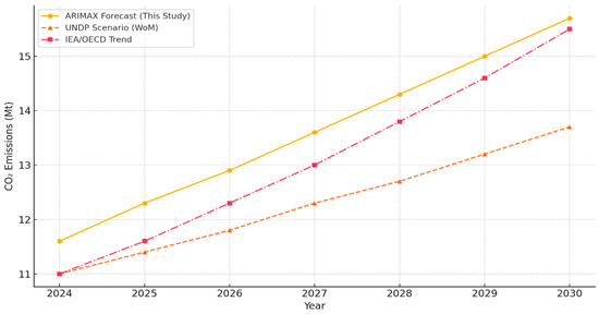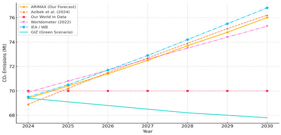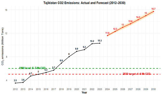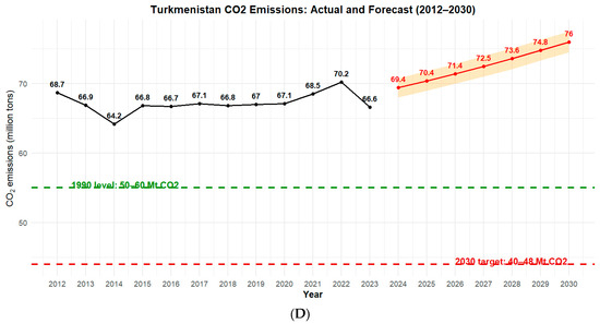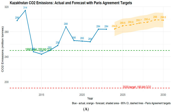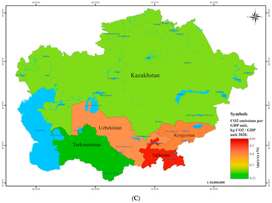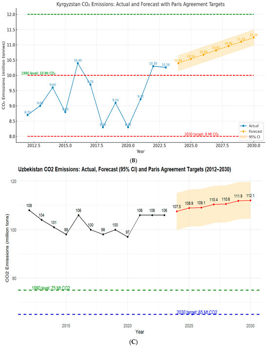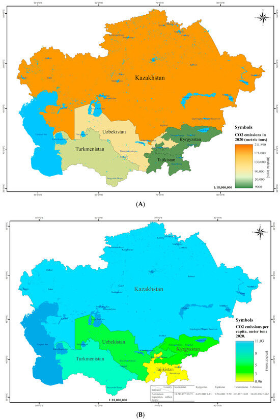 To keep temperatures below 1.5 °C, a central objective of global initiatives aimed at addressing climate change is to decrease emissions of CO2 and other GHGs by 45% by the year 2030, relative to levels recorded in 2010 [22,23]. In this context, leading countries, with a 25% share of global GDP, have established legal obligations to achieve net-zero emissions targets under the Paris Agreement (https://www.un.org/ru/climatechange/paris-agreement, accessed 12 October 2024). All CACs have signed the Paris Agreement. Moreover, within the framework of its implementation, Kazakhstan has undertaken obligations to achieve a reduction in GHG emissions of 15% by 2030 compared to the 1990 baseline level with the possibility of increasing this target to 25% under specific conditions [24]. The target indicators for 2050 for Central Asian countries are currently under development. In particular, Kazakhstan has presented its Voluntary National Review 2025, outlining its target orientation up to 2030.