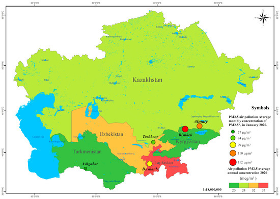 Geospatial analysis of emissions is performed using mapping modeling in ArcGIS 10.8 based on EDGAR data and Sentinel-5P satellite measurements. The analysis produced maps of the geographic distribution of CO2, PM2.5 and SO2 in 2020, heat maps of emissions changes from 1990 to 2024, and a mapping analysis of urban areas with the highest emissions. ArcMap 10.8 software was used to create maps of CO2 emissions and average monthly concentrations of PM2.5 air pollution in CACs in 2020. Emissions data were taken from public sources such as global environmental databases (e.g., EDGAR, Global Carbon Project) and national environmental monitoring agencies. ArcMap 10.8 introduced basemaps that visualize data using color gradations, from light for low outliers to dark for high outliers. Data of PM2.5 concentrations in individual cities, taken from [9] are presented as colored circles of different sizes and colors symbolizing a certain level of air pollution. Data on PM2.5 concentrations collected from ground stations or satellite sources [9]. These data were grouped into ranges (27, 74, 99, 110 and 112 μg/m3) to reflect the degree of pollution in each city represented.