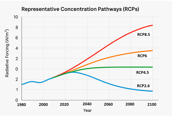 - van Vuuren, D.P.; Edmonds, J.; Kainuma, M.; Riahi, K.; Thomson, A.; Hibbard, K.; Hurtt, G.C.; Kram, T.; Krey, V.; Lamarque, J.-F.; et al. The representative concentration pathways: An overview. Clim. Change 2011, 109, 5–31. [Google Scholar] [CrossRef]