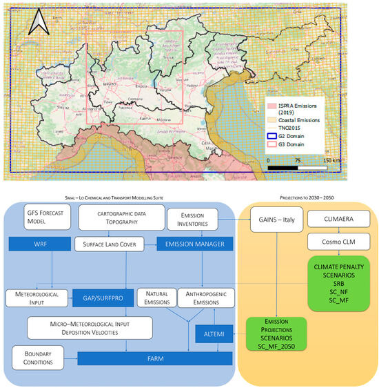 The air modeling system of ARPA Lombardia (SMAL-LO) is based on ARIA Regional developed by AriaNET srl and it is characterized by two different domain extension: one for the Lombardy Region (in Figure 2 represented by red line named g3) and one for the PREPAIR project (in Figure 2 represented by blue line named g2), which includes the Po Valley extended from the western (Piemonte and Valle d’Aosta Regions) to the eastern part (Slovenia) and from the northern (Trento Province and Friuli Venezia Giulia Region) to the southern part (Emilia-Romagna Region). The last one consists of 105 × 210 with a cell resolution of 4 km. The main workflow of modeling architecture is composed in Figure 2.