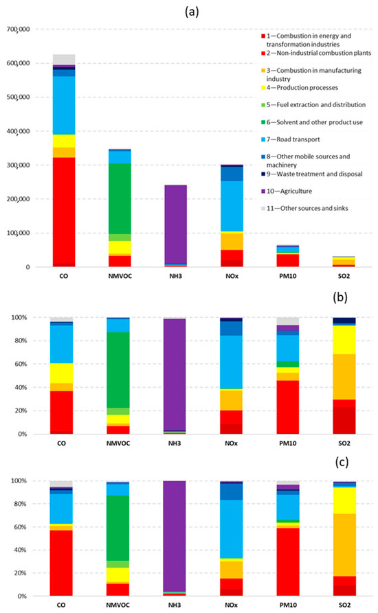 Emission inventory in the base year on the Po basin. (a) Total annual emission on the domain t year-1, (b) emission share in Lombardy, (c) emission share in the other regions of the Po Valley.