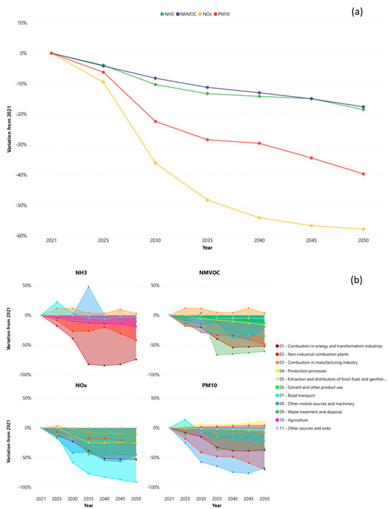 Emission projection from 2021 to 2050, according to Current Legislation in Italy. (a) Total annual emissions variation for the main pollutants. (b) Emissions variation from 2021 for aggregated main sectors.