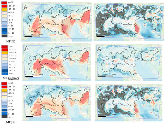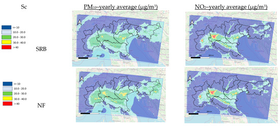 The results obtained from the annual simulations are presented as concentrations maps for each pollutant and scenario (Figure 5). In addition, both absolute and relative (percentage) differences were calculated between the SRB and the NF and/or MF scenarios.