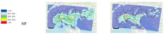 For PM10, under the SRB scenario, the highest concentrations were observed in the provinces of Milan and Lodi (Lombardy Region), in central Emilia-Romagna and in several areas of the Veneto Region. These values were significantly higher compared to those in the southern Apennines and northern Alpine arc. In the NF and MF scenarios, areas affected by elevated PM10 concentrations expand to cover the entire Po Valley, including provinces such as Turin, Milan, Ferrara and Padua.