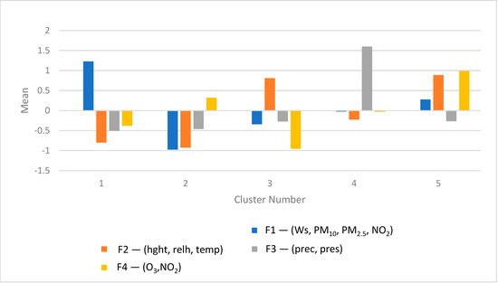 Figure 7 shows the deviation of each cluster’s mean varifactor values from the overall dataset mean. Longer bars indicate stronger deviations from the mean (set at zero), highlighting variables with high discriminative power within each cluster. For example, Cluster 1 is characterized by elevated concentrations (e.g., 1–2 times above the mean) of pollutant-related factors. In contrast, Cluster 2, dominated by the first principal component (PC1), exhibits concentration values approximately one standard unit below the mean.