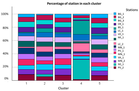 Still, referring to Figure 8 and focusing on the Lombardy Region, the number of observations representing each monitoring station within each cluster is also shown. Cluster Analysis (CA) enables the identification of the most “representative” station (s) for each cluster. For instance, BS_1 and SO_1 stations—located in mountainous areas—are predominantly associated with Cluster 4, which shows higher values of Factor 3 (F3), typically linked to increased precipitation and lower pollutant concentrations (Figure 8). Conversely, these stations are absent from Cluster 1, which is characterized by high pollutant levels and reduced wind speed conditions typical of the central Po Valley.