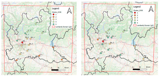 Mapping stations with cluster belonging (Figure 9) we can see that mountainous stations do not change their cluster number (4) from 2030 to 2050, remaining affected only by meteorological parameters. On the other hand, on the Pre-Alps and Plain, some stations change their prevalent cluster behavior from 2030 to 2050 (i.e., passing from only meteo-dependency (Cluster 2 2030) to only contaminants dependency (Cluster 5 2050)). This should be investigated for possible chemical regime change during climate change events.