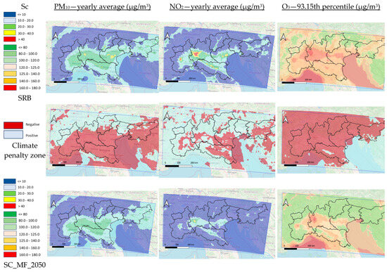 By comparing the absolute differences between the MF (climate-only) and SC_MF_2050, (climate plus mitigation) scenarios, we identified the so-called climate penalty zone for the main contaminants. These are areas (Figure 10) where the projected increase in concentration due to climate change (MF) exceeds the benefit obtained from emission reduction scenario (SC_MF_2050). For NO2, the “climate penalty zone” are predominantly aligned with major roads networks, while for PM10 (and PM2.5), they are mostly located across the central lowlands, confirming the findings of the cluster analysis. Furthermore, for O3, when considering 93.15yh percentile maximum daily 8 h average concentration, negative areas extend over the entire Po Valley, except for the main road corridor in Emilia-Romagna. These results are consistent with the PCA/FA outcomes, where ozone appears only in Factor 4 (Table 2).