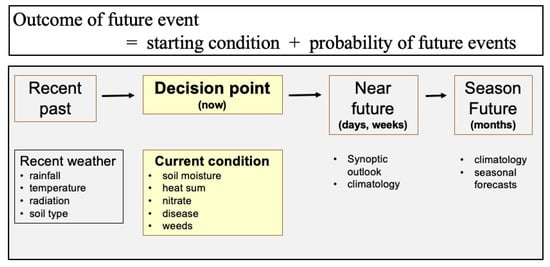 A decision framework for climate-related decisions in agriculture where an outcome of a decision is based on a balance between current conditions and the probability of future events.