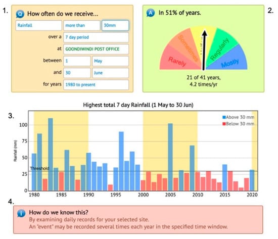 CliMate’s interface was designed to encourage a “discussive” or explorative approach to current conditions and future expectations given its ability to iterate through adjustments to queries of the climate record. CliMate’s reliance on “climatology” rather than forecasts was a purposeful decision in the spirit of maintaining simplicity and transparency and based on user feedback. An application of a seasonal forecast signal was initially included (How likely?), but during construction, skills in forecasts were in a state of flux [,], and specialised forecast information was available elsewhere [,].