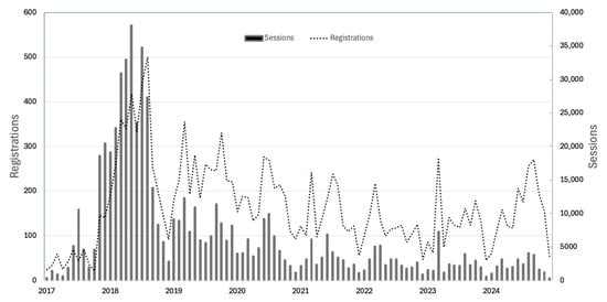 Registrations and sessions recorded (2017–2025 n = 19,000).