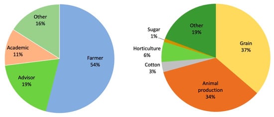 Grain and animal production users accounted for 70% of users, while farmers were the most common user group by profession (Figure 6). The top 100 users have accessed CliMate for ~800 sessions (median), dominated by consultants and insurers. With approximately 85,500 agricultural enterprises in Australia [] and ~6000 agricultural consultants [], we estimate ~50% of agricultural consultants have used CliMate since its release.