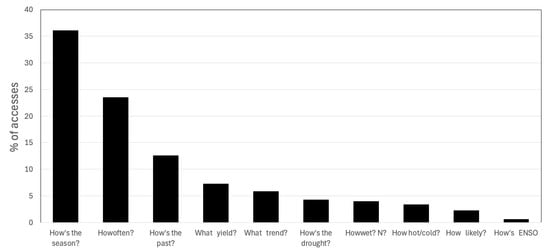 Of the 10 analyses available, the most used analysis was “How’s the season?” (Figure 7), followed by the probabilistic How often? and the longer view How’s the past? Most analyses were used >5000 times annually. Farmers used How’s the season? the most, grain farmers used Yield potential? the most, and academics used What trend? the most.