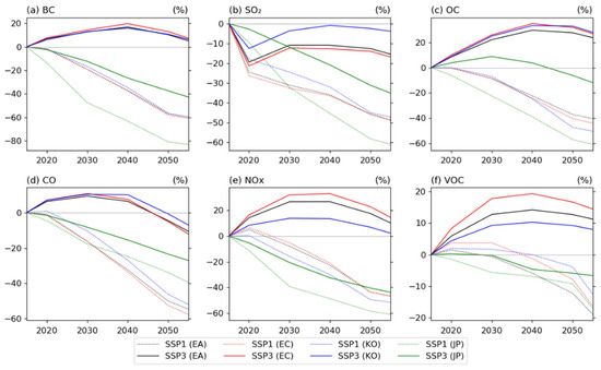 Time series of averaged emissions of (a) black carbon (BC), (b) sulfur dioxide (SO2), (c) organic carbon (OC), (d) carbon monoxide (CO), (e) nitrogen oxides (NOx), and (f) volatile organic compounds (VOCs) from 2015 to 2054 under SSP3 (solid) and SSP1 (dotted line) scenarios over East Asia (EA; black), East China (EC; red), Korea (KO; blue), and Japan (JP, green). The Y-axis indicates the percentage change in near-term climate forcer (NTCF) mitigation.