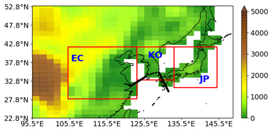 Three subregional domains overlaid with the terrain height (unit: m) over EA, as analyzed in this study. Each red square denotes the EC, KO, and JP regions.