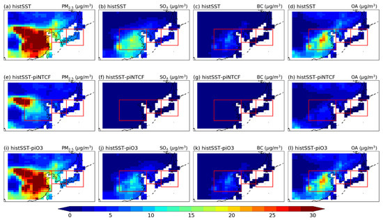 Spatial distribution of annual mean surface PM2.5 concentrations (first column) and their major components (SO4, second column; BC, third column; and OA, fourth column) from the histSST (a–d, top row), histSST-piNTCF (e–h, middle row), and histSST-piO3 (i–l, bottom row) experiments for the present-day period (1995–2014). Red squares indicate the EC, KO, and JP regions from left to right.